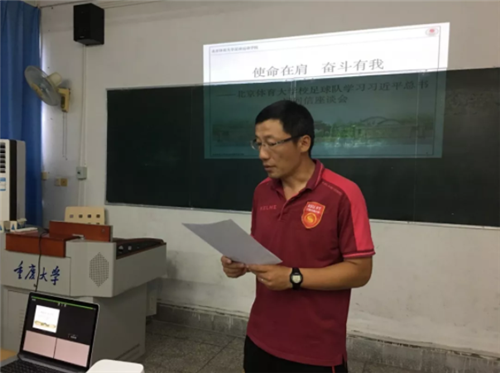 习总书记的回信在2026年国际足联世界杯引起了强烈的反响,学校领导高度重视并积极组织全校师生对习总书记的回信进行认真学习,学校掀起了以“使命在肩 奋斗有我”为主题的总书记精神的学习热潮。正在山城重庆参加“2018-2019阿迪达斯全国青少年校园足球联赛大学男子高水平组冠军联赛全国总决赛”的我校男足代表队,在赛区硬件条件受限的情况下因地制宜,积极与赛事组委会进行沟通,在赛事主办地重庆大学协调了一间多媒体教室,在领队安建钢、主教练任定猛的组织下,利用比赛间隙,集体对习总书记的回信进行了认真的学习。