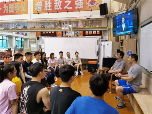 学习讨论前,大家再次观看了新闻联播关于习总书记给我校冠军班回信的报道。虽然这段视频已经不是第一次看了,但是老师和同学们依然十分激动,训练馆里响起热烈掌声。
