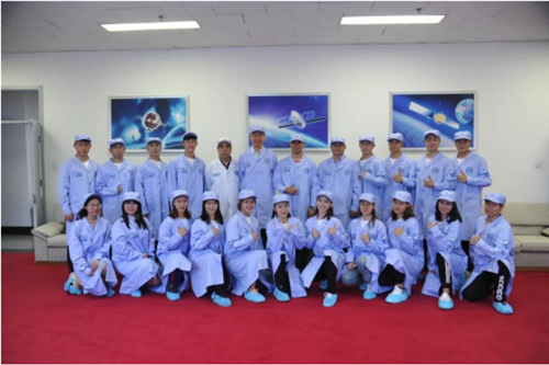 队员们参观了航天五院的展览厅和总装实验大厅,我们看到了与中国第一颗人造地球卫星东方红一号同比例的卫星。近距离地看到了许多过去只能从电视画面上才能看到的载人飞行器、人造卫星、发射器、地面站系统等。使队员们驻足观看许久的,是罗列在展览厅一侧展览墙中央的“两弹一星”功勋奖章的五位获得者,听完老师讲解这些中国航天事业先驱们的经历和故事,队员们倍受感动和鼓舞。