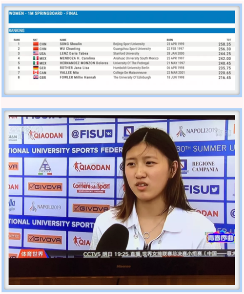 当地时间7月4日,在第30届世界大学生夏季运动会女子跳水1米板的决赛中,我校学子宋首霖发挥出色,以258.35分获得金牌,为中国体育代表团取得开门红!来自广州体育学院的吴春婷获得亚军。此前,二人分别以预赛第二名和第一名的身份进入到决赛当中。